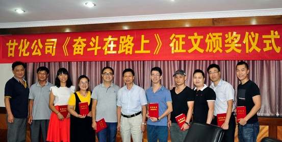 2018年8月17日下午,在甘化大廈15樓會(huì)議室,公司黨委、工會(huì)舉辦《奮斗在路上》獲獎(jiǎng)?wù)魑念C獎(jiǎng)儀式。本次活動(dòng)共收到征文11篇,參賽征文經(jīng)專業(yè)評(píng)委評(píng)選,獲獎(jiǎng)10篇。公司各支部委員、工會(huì)委員和征文作者共16人參加了會(huì)議。