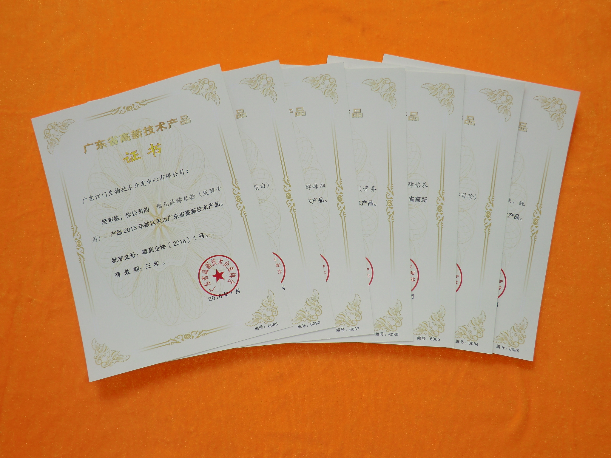 2016年1月份,生物中心的食用酵母、榴花牌酵母粉、酵母抽提物、酵母精粉、破壁型食用酵母、風味復合酵母、甘蔗糖蜜酵母發酵培養物共7項產品通過省科技廳嚴格審核,獲認定為2015年“廣東省高新技術產品”并取得證書。
